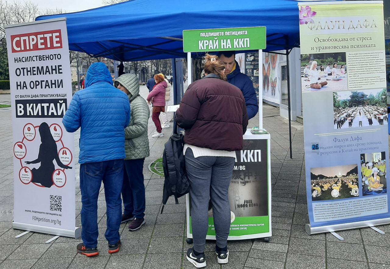 На 28 март 2026 г., Дафа практикуващи от градовете Бургас, Стара Загора, Велико Търново, Ямбол и Украйна се събраха на пешеходната зона на бул. „Алеко Богориди“ до Общината, за да проведат събитие-подписка за спиране на преследването на Фалун Дафа в Китай. -