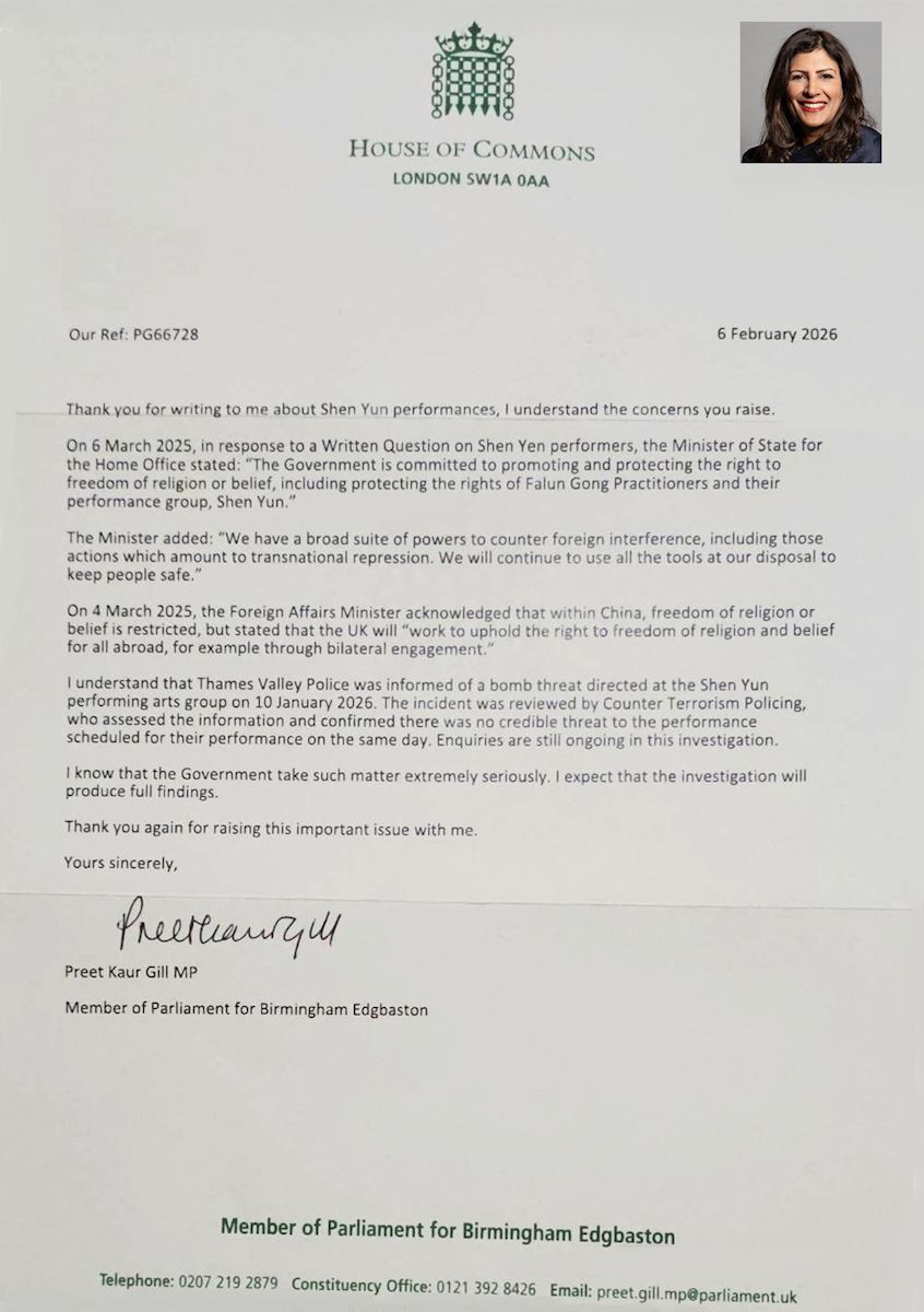 (Minghui.org) След като Министерството на външните работи, по въпросите на общността и развитието, и Министерството на вътрешните работи на Великобритания излязоха с изявления, в които осъдиха действията на Китайската комунистическа партия (ККП) срещу трупата Shen Yun Performing Arts и театрите, в които се провеждаха представленията на „Шен Юн“ (Shen Yun), няколко членове на парламента изразиха своето безпокойство. Те написаха, че правителството на Великобритания се отнася внимателно към случаите на транснационални репресии и че натискът и заплахите по отношение на „Шен Юн“ на територията на Великобритания представляват, само по себе си, посегателство върху националната сигурност и суверенитет на страната. -